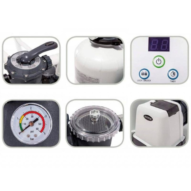 Для очистки воды от механических загрязнений и взвешенных частиц в бассейне используется песочный фильтр-насос производительностью 8000л/ч, диаметр шлангов 38мм. В качестве фильтрующего элемента используется специально просеянный кварцевый песок 0,45-0,85 мм